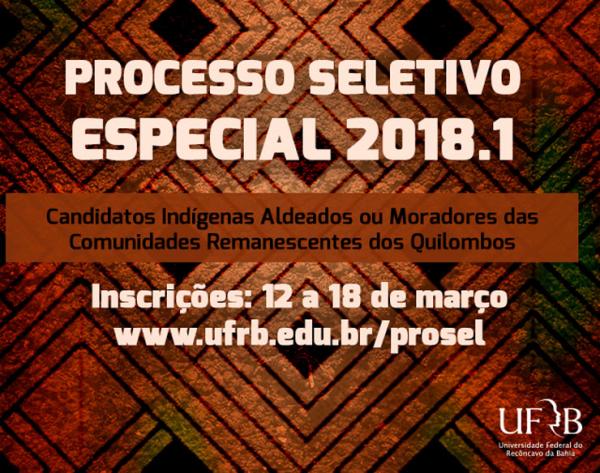A Universidade Federal do Recôncavo da Bahia (UFRB), por meio de sua Pró-Reitoria de Graduação (PROGRAD), anuncia o processo seletivo especial para candidatos indígenas aldeados ou moradores das comunidades remanescentes dos quilombos. São ofertadas 22 vagas em 18 cursos de graduação para ingresso no semestre letivo 2018.1.